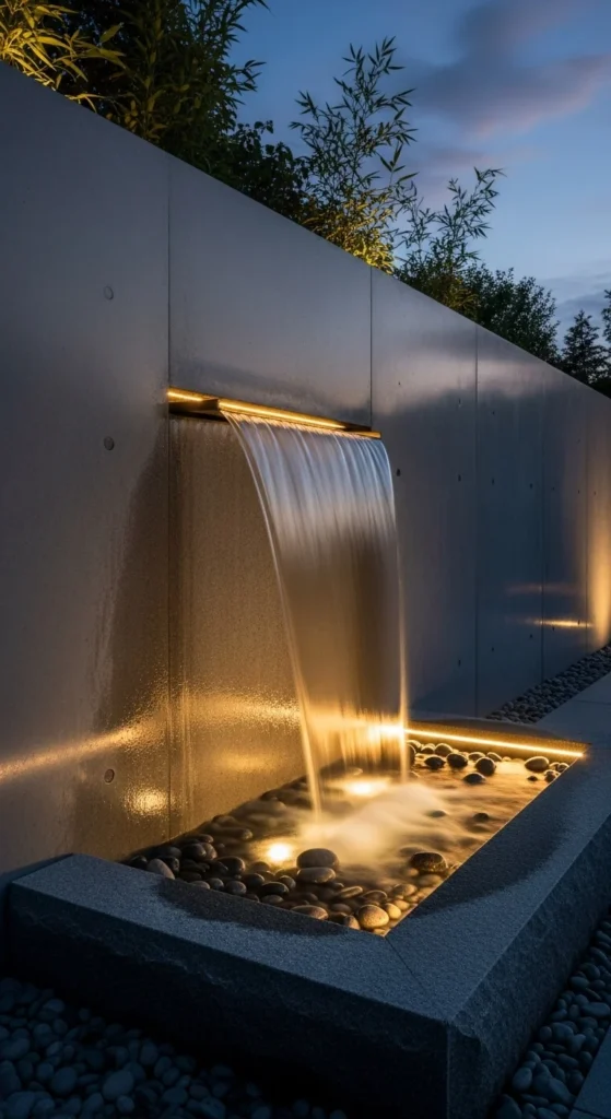 Add a modern touch with a sheet-style waterfall built into a wall. It creates clean lines and soothing movement. Pair it with soft lighting for evening sparkle. Many prefab designs install easily against fences or garden walls for a minimalist yet striking look.