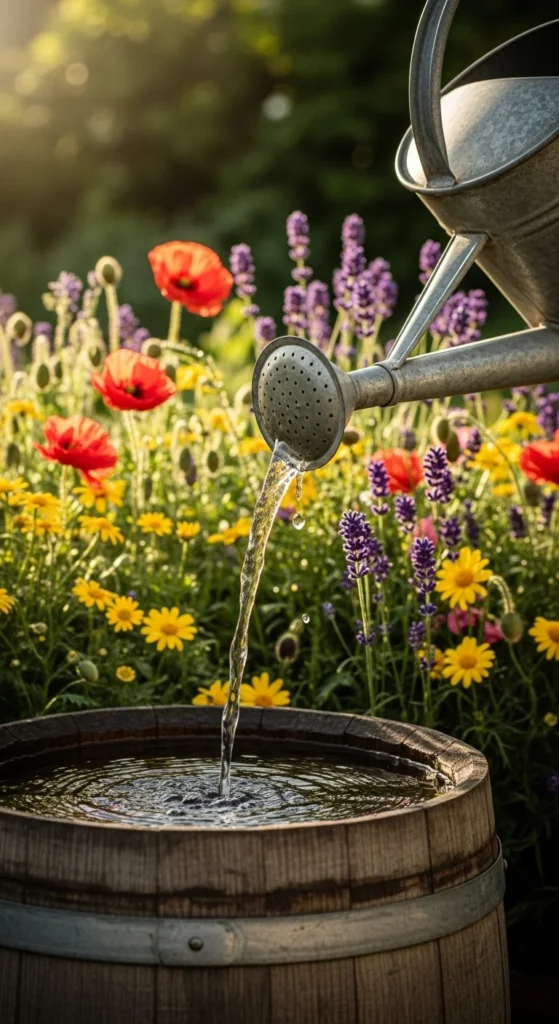Turn an old watering can into a charming garden feature. Add a pump inside the barrel to recycle the water. It’s a simple DIY that costs little but adds a lot of character. This playful setup fits beautifully into cottage gardens or farmhouse patios.