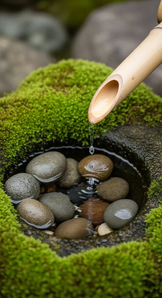 Inspired by Japanese gardens, this design adds quiet elegance. A bamboo spout gently pours water into a stone basin, creating a rhythmic sound. It’s simple, sustainable, and can be made with a solar pump for convenience.
