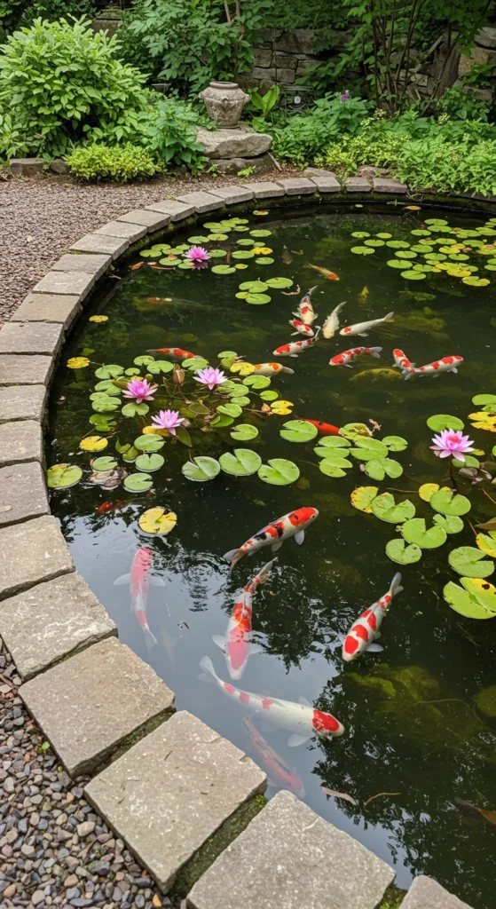 A koi pond adds movement and beauty. Keep it simple by lining a small hole with a pond liner and adding stones around the edges. Koi need space, so start small with just a few. Add lilies or lotus to give shade and balance the ecosystem. This idea works well as a backyard focal point and doesn’t require fancy equipment.