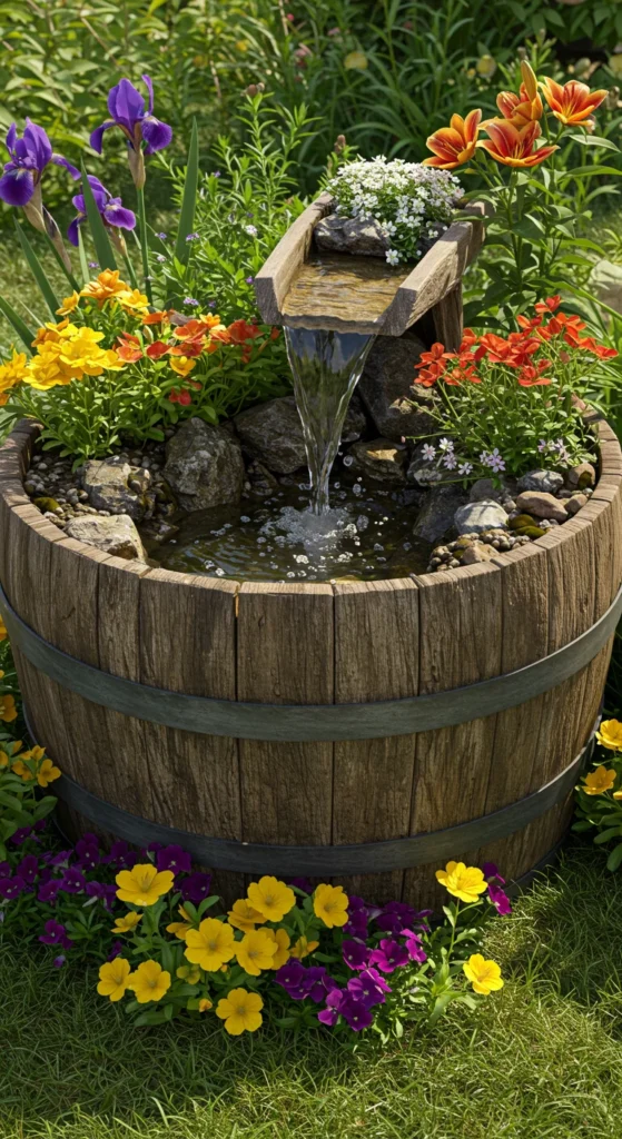 Repurpose a barrel into a miniature waterfall feature. Add a small pump to circulate water. Surround it with flowers for a rustic, country feel. It’s affordable and easy to assemble as a DIY project.