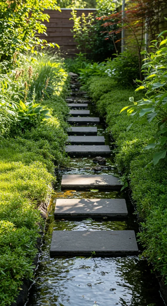 Streams add movement and natural sound. Dig a shallow path and line it with stones. Add a pump to circulate water from one end to the other. Stepping stones create charm and invite interaction.