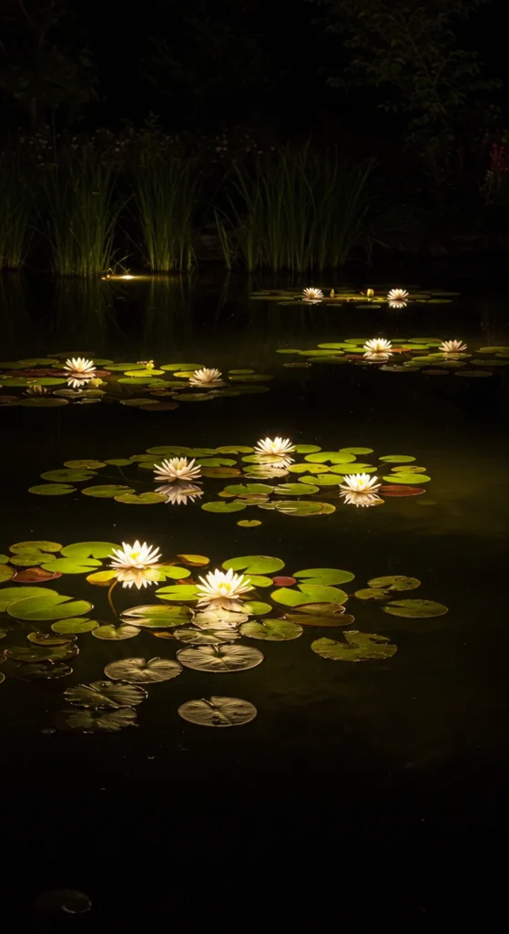 Lights make water magical after dark. Submersible LED lights can highlight ripples, fountains, or fish. Solar lanterns around the edges add ambiance without extra wiring.