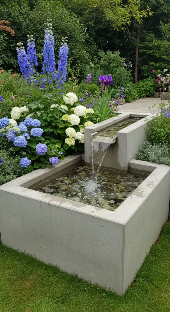 Combine raised beds with a water element. A small basin in the center provides a focal point and attracts pollinators. It’s an unusual twist on standard flower beds.