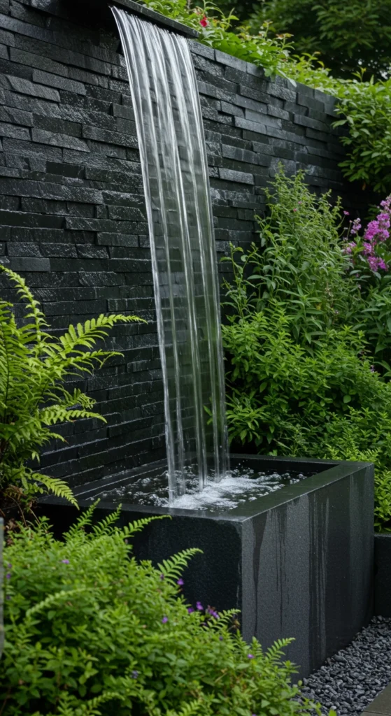 Stack flat stones to create a natural-looking waterfall. Add a small pump to circulate water. This works as a centerpiece in flower beds or along a pathway. Plant ferns, hostas, or grasses around the edges for a natural finish.