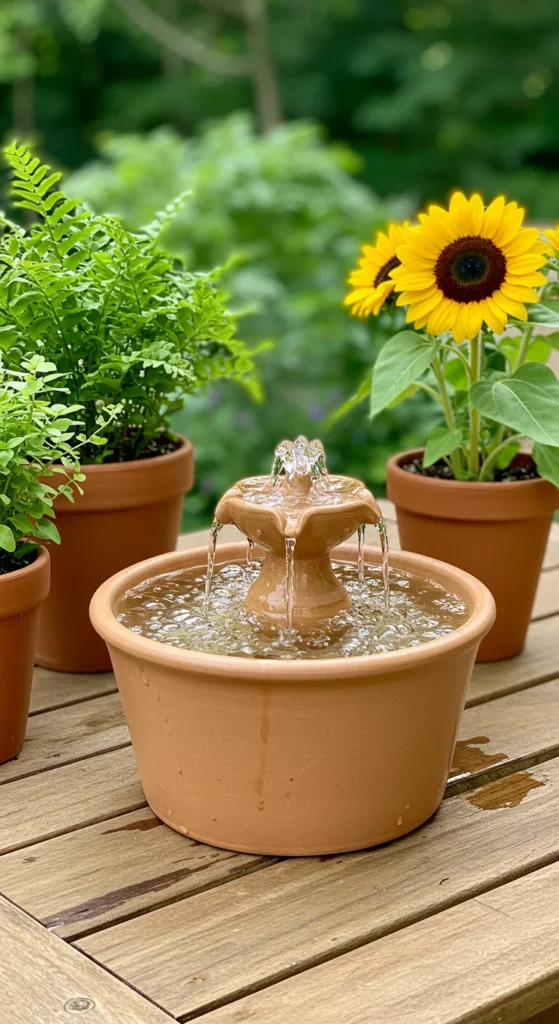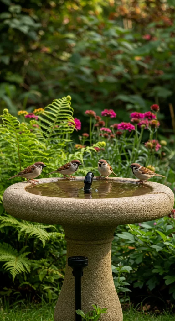 Bird baths attract wildlife, but adding a gentle fountain keeps the water moving and clean. Use solar-powered pumps for an easy, eco-friendly solution. Birds will love it, and you’ll enjoy their visits daily.