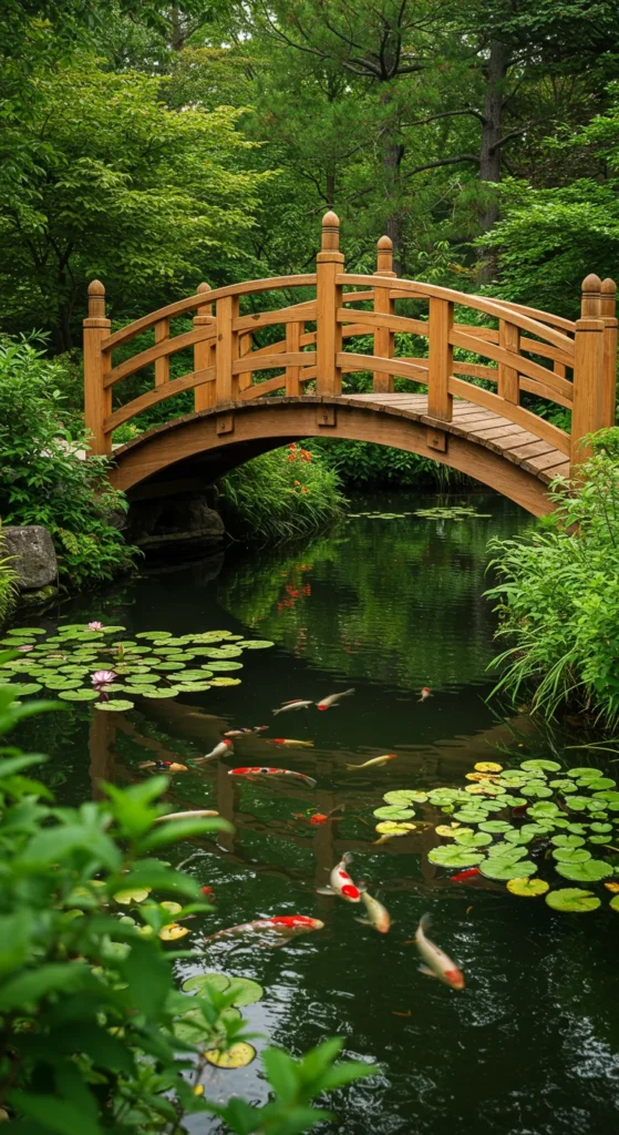 Bridges add romance to ponds. Even a small wooden plank across a water feature creates charm. It’s functional too, allowing you to view fish and plants from above.