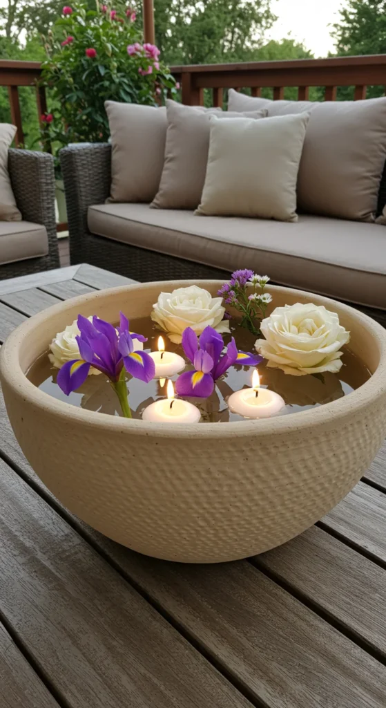 A water garden doesn’t have to be big. Use a bowl or large dish, fill it with water, and add floating flowers or candles. Place it on a patio table for a simple yet enchanting display.