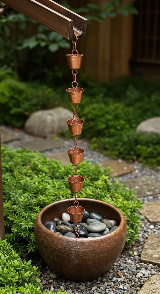 Rain chains are practical and artistic. Replace a traditional downspout with one, and let rainwater trickle into a bowl of stones or a barrel. The gentle flow makes rainy days more enjoyable and adds character to your garden.