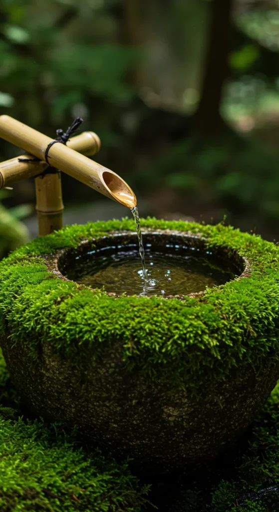 A bamboo water spout adds a Japanese-inspired touch. Position it over a small basin or stone bowl. The gentle sound creates a calming rhythm. Combine it with moss and ferns to complete the Zen aesthetic.
