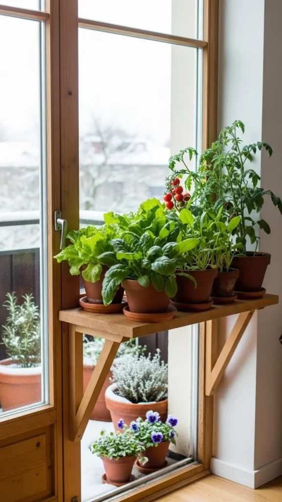 If your balcony gets crowded, extend growing space inside near the window. Use a window ledge extender or small shelf to hold extra pots. Grow herbs, greens, or seedlings here. The indoor warmth speeds growth, while natural light supports healthy leaves. This extension blends indoor and outdoor gardening, keeping everything reachable and orderly.