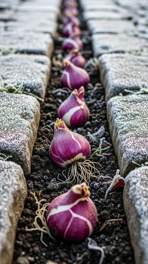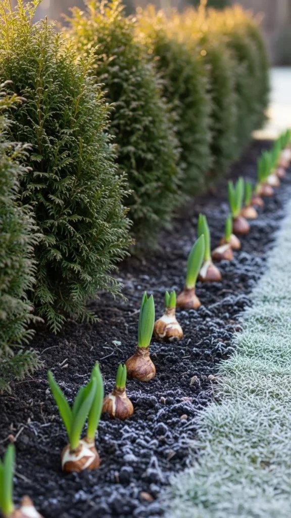 Pathways collect extra heat from sun exposure. Planting bulbs along these strips helps them sprout early. Dig a shallow trench and add compost. Line bulbs evenly and cover with soil. This creates a tidy border that brightens walkways once spring starts. It’s a good approach for small yards because the narrow strip maximizes space. Add a thin mulch layer for insulation. Water lightly after planting. As temperatures warm, blooms appear quickly because the stones hold daytime warmth.