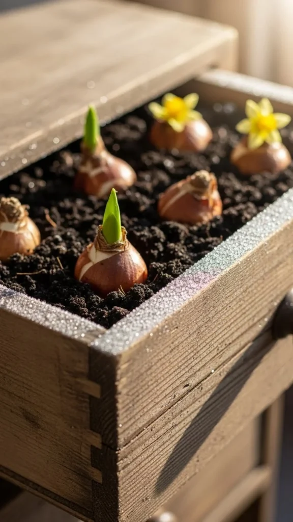 Old drawers make great bulb containers. Drill drainage holes at the bottom. Line with burlap or newspaper, then add soil and compost. Place bulbs evenly and cover with soil. Set the drawer on bricks so moisture drains well. This works for small patios or rented homes. It’s also a low-cost method if you have unused furniture pieces. Water lightly. In spring, the flowers look charming in their rustic frame.