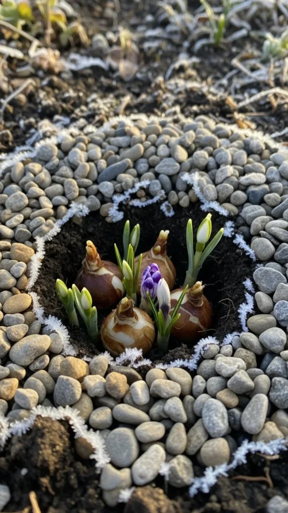 If your yard stays wet, a gravel base keeps bulbs safe. Dig a hole deeper than usual and pour in one inch of small gravel. Place bulbs on top, then cover with soil. The gravel prevents water from pooling under bulbs. This helps reduce rot in water-heavy regions. It’s a low-cost trick for gardeners dealing with soggy spots. You can use leftover aquarium gravel or landscaping gravel. Check soil height so bulbs don’t sit too shallow. Add mulch if your winter wind is strong. When warmer days arrive, sprouts pass easily through soil because the gravel sits below, not above.