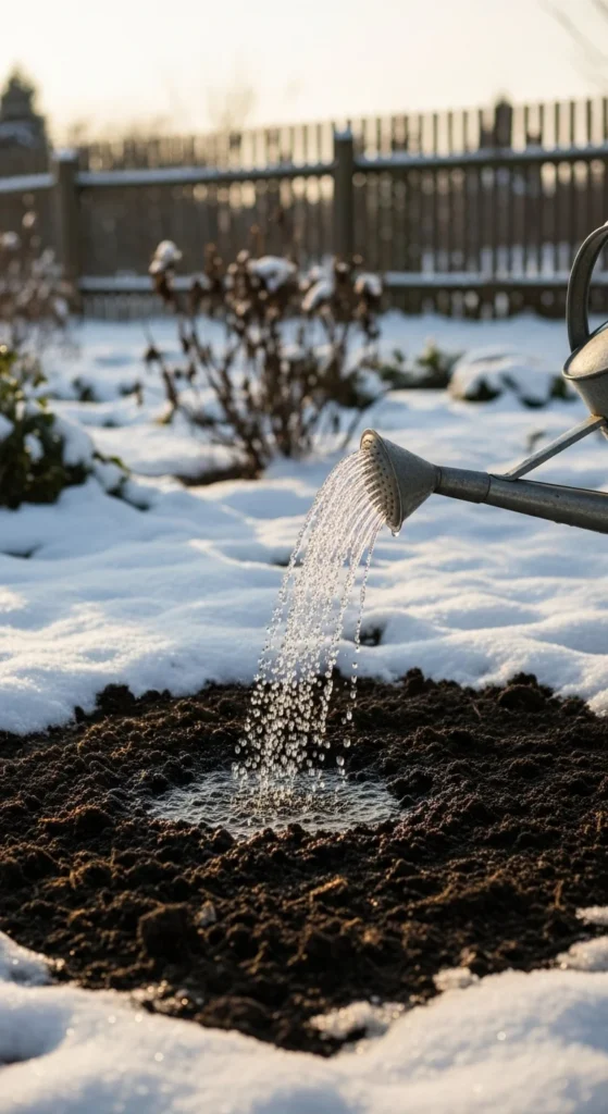 Dry soil cools faster and damages roots. Keep soil slightly moist—not soggy—throughout winter. Water during midday when temperatures are warmer to avoid ice formation. Moist soil helps roots breathe and prevents dehydration caused by winter winds.