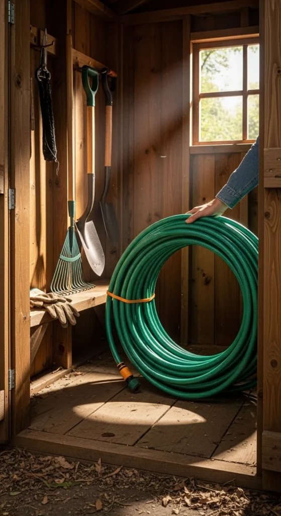 Freezing water can crack hoses. Drain them completely and store inside your garage or shed. This simple step prevents damage and extends hose life. Keep one short hose handy indoors for occasional watering on warmer days.