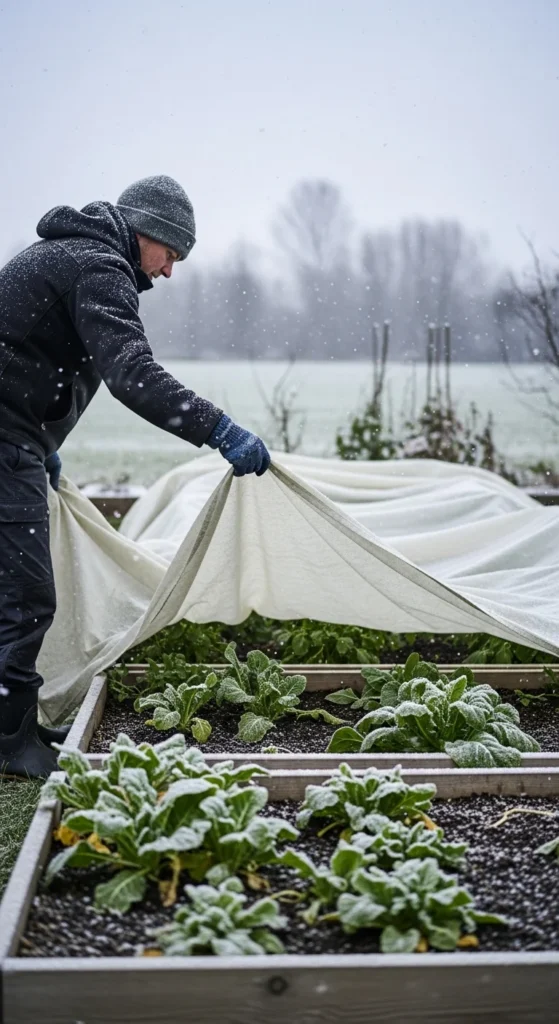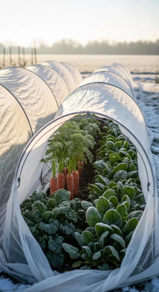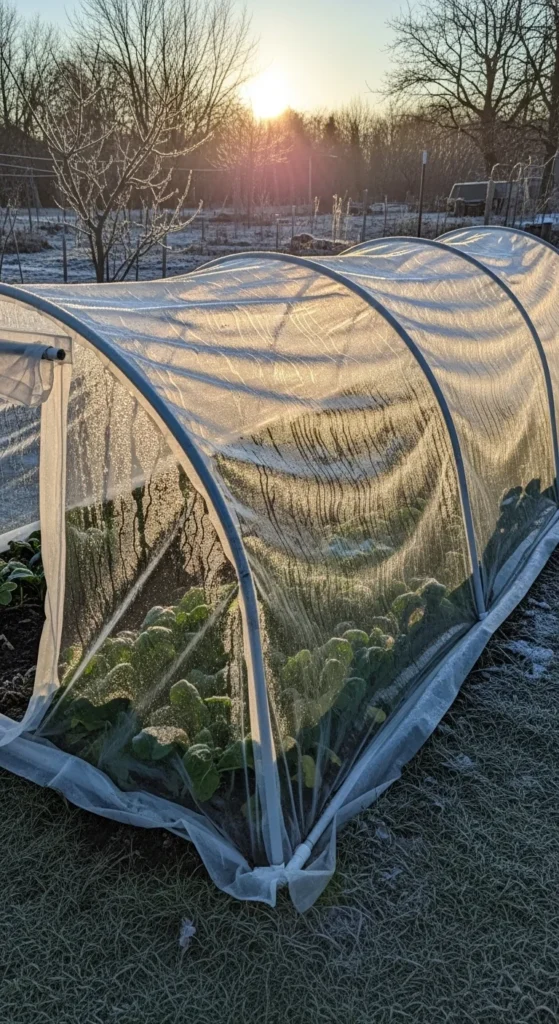 Row covers protect plants from frost and pests. Use lightweight fabric that lets air and moisture through. Secure the edges with soil or stones. Leave enough space for plants to grow underneath. Row covers are reusable and perfect for winter greens.