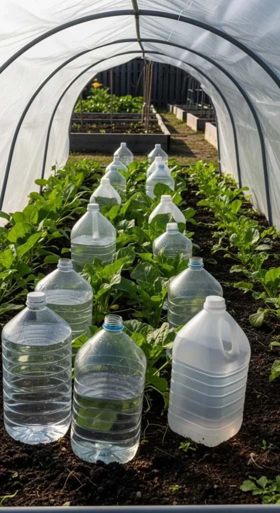 Fill dark-colored jugs with water and place them around your plants. During the day, they absorb sunlight; at night, they release stored heat. This small thermal trick can raise nighttime temperatures around your plants by a few degrees.