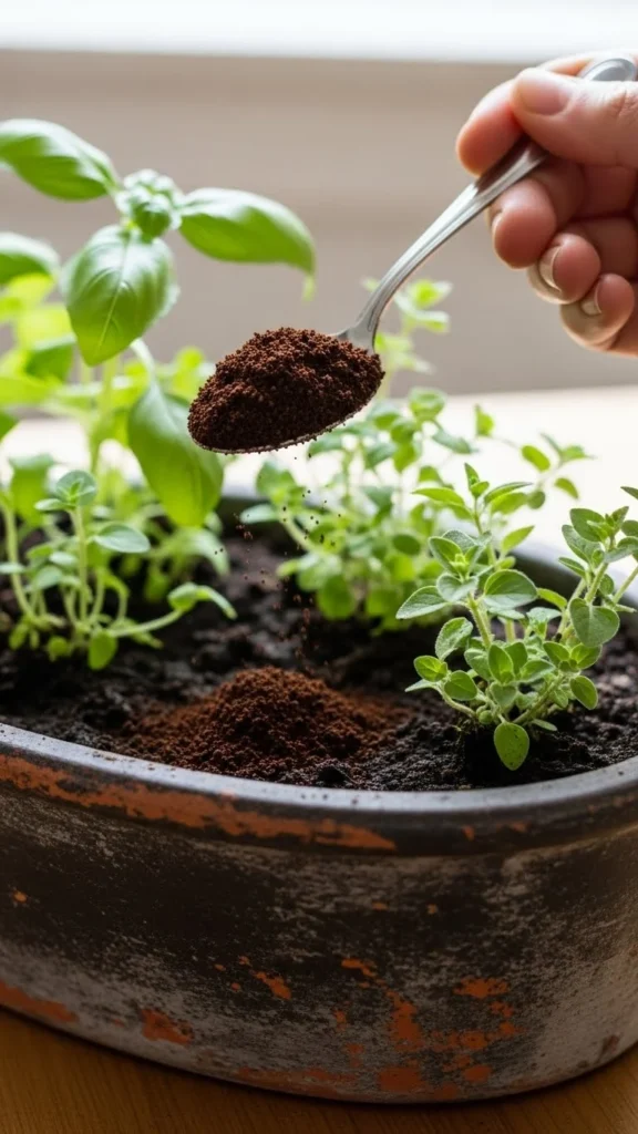 Coffee grounds can help soil texture but only in small amounts. Sprinkle a tiny pinch on top once every few weeks. Mix lightly into the top layer. This helps soil stay loose. Too much makes soil dense. If you drink coffee daily, use only a small amount and compost the rest. Herbs like basil and parsley respond well to this trick. It costs nothing and reduces kitchen waste. Always keep soil airy to help roots breathe.