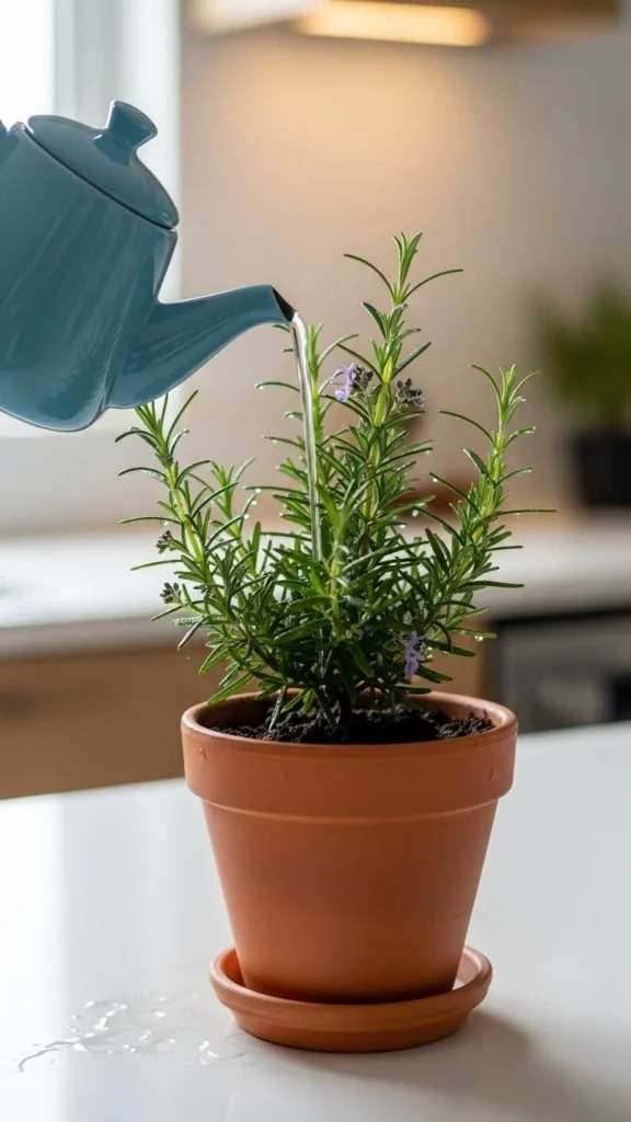 Rosemary prefers dry conditions. Overwatering makes it struggle. Let the soil dry almost completely before watering again. Use a clay pot for better airflow. Place rosemary near a sunny window. This herb handles winter light better than others. Trim lightly to keep the shape tidy. If leaves brown at the base, you’re watering too much. Adjust slowly. Rosemary grows well indoors with careful watering and strong light.