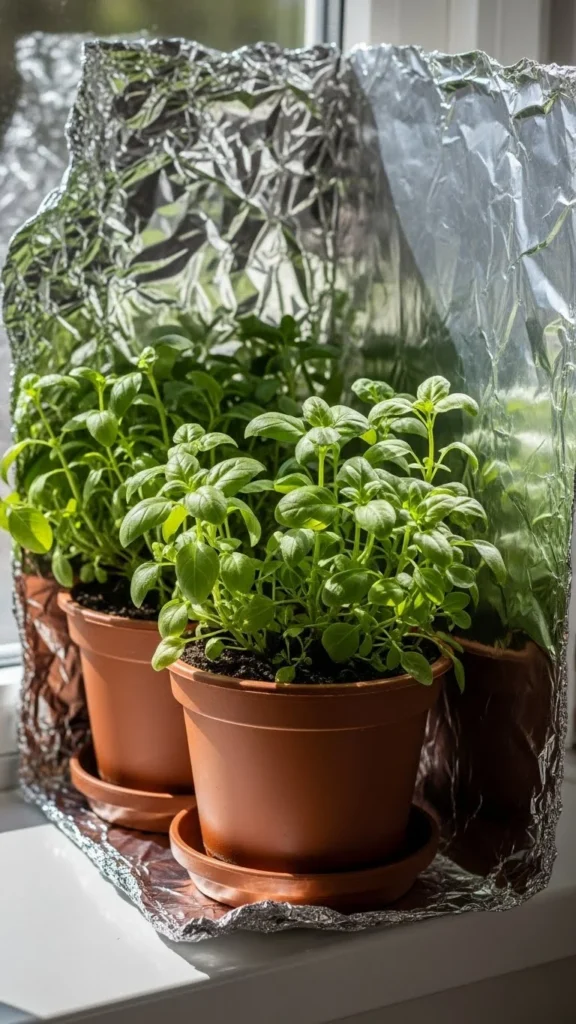Foil reflects extra light, helping herbs grow better. Place a small piece behind your pots so sunlight bounces back. This trick costs almost nothing. It works well in dim kitchens. Keep the foil smooth for a clear reflection. Place it at an angle so the light spreads. This method gives plants a small energy boost without buying new equipment. It’s simple and very effective.
