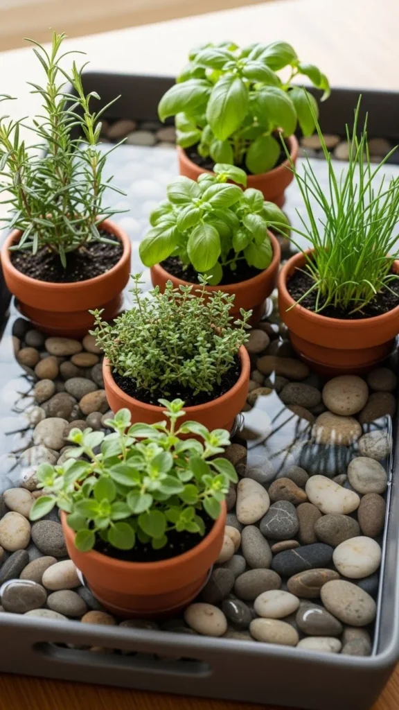 Winter air gets dry indoors, especially with heaters running. Placing herb pots on a tray filled with pebbles and a little water helps them stay comfortable. The water evaporates slowly and increases humidity around the plants. This trick costs very little and works for most herbs. Make sure the pot sits on the stones, not in the water. Constant soaking harms roots. This setup also keeps pots steady. If you don’t have pebbles, use marbles or small rocks you already own. Check the tray every few days and refill as needed. This simple system helps leaves stay soft and green. It also helps prevent crispy edges that appear during cold months. A bit of extra moisture goes a long way for winter herbs.