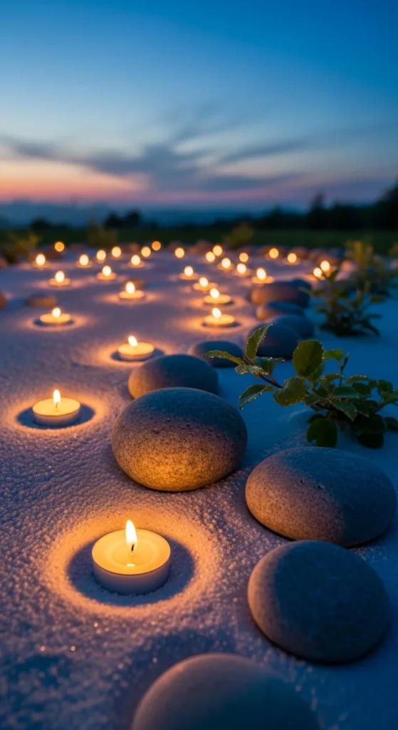 Candlelight brings warmth and focus. Arrange candles in glass holders across your gravel space or along a path. Use unscented candles for pure ambiance. Great for evening meditation or reflection — especially after a long, stressful day.