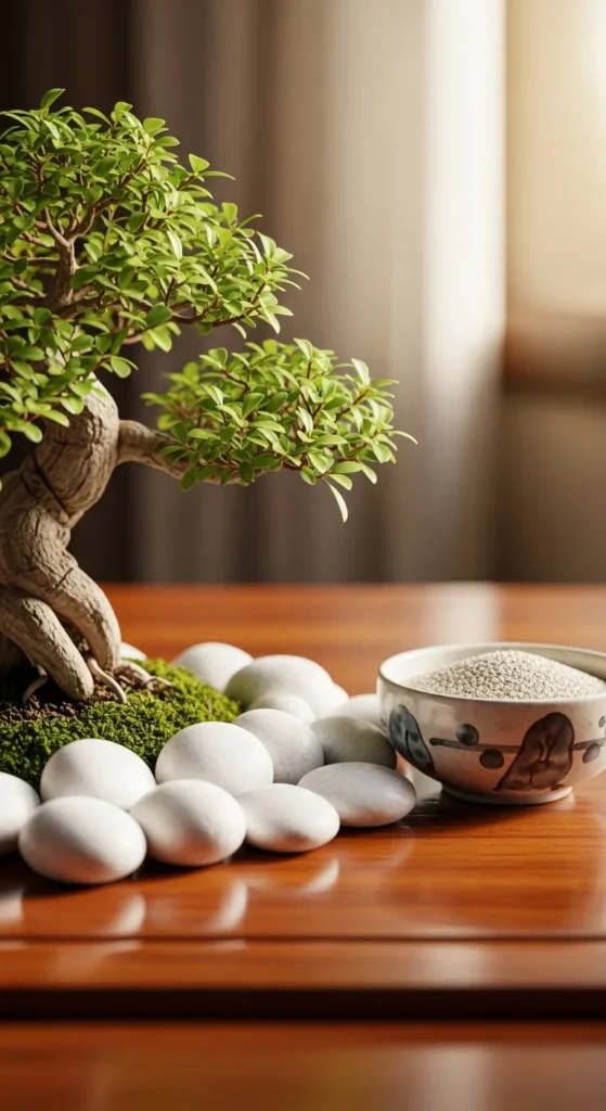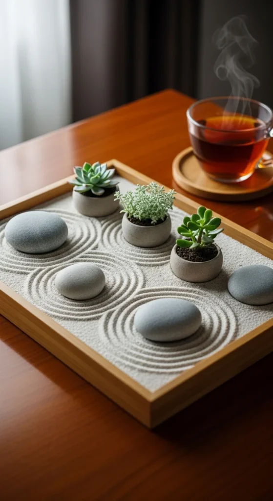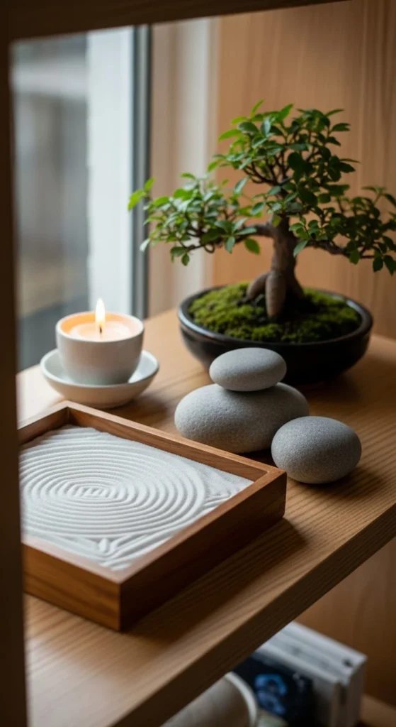 Don’t have outdoor space? Create an indoor Zen shelf. Use a small sand tray, stones, and plants on a bookshelf or table. Keep it minimal and clean. It’s a daily reminder to slow down and breathe — even indoors.