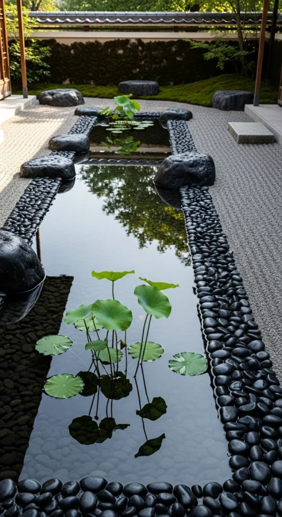 If space allows, include a small reflective pond. Keep it minimal — just clean water and a few stones or plants. The mirror-like surface creates a sense of infinity. Even a large ceramic bowl can work for small patios.