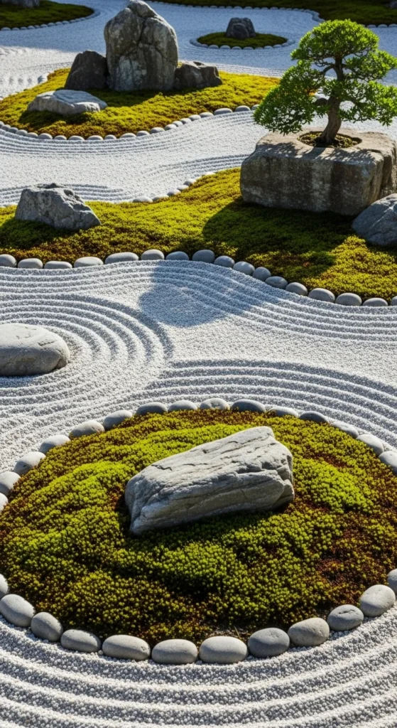 Mix textures for visual harmony. Alternate gravel and green areas — maybe one for sand, one for moss. This combination reflects balance between stillness and growth. It also softens the look of large gravel spaces.