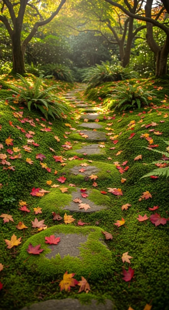 Moss adds instant tranquility. Create a moss-covered walkway between garden stones. Mist it often to keep it lush. Moss grows best in shady, damp spots — making it ideal for low-maintenance relaxation zones. You can even use artificial moss mats for a quick setup.