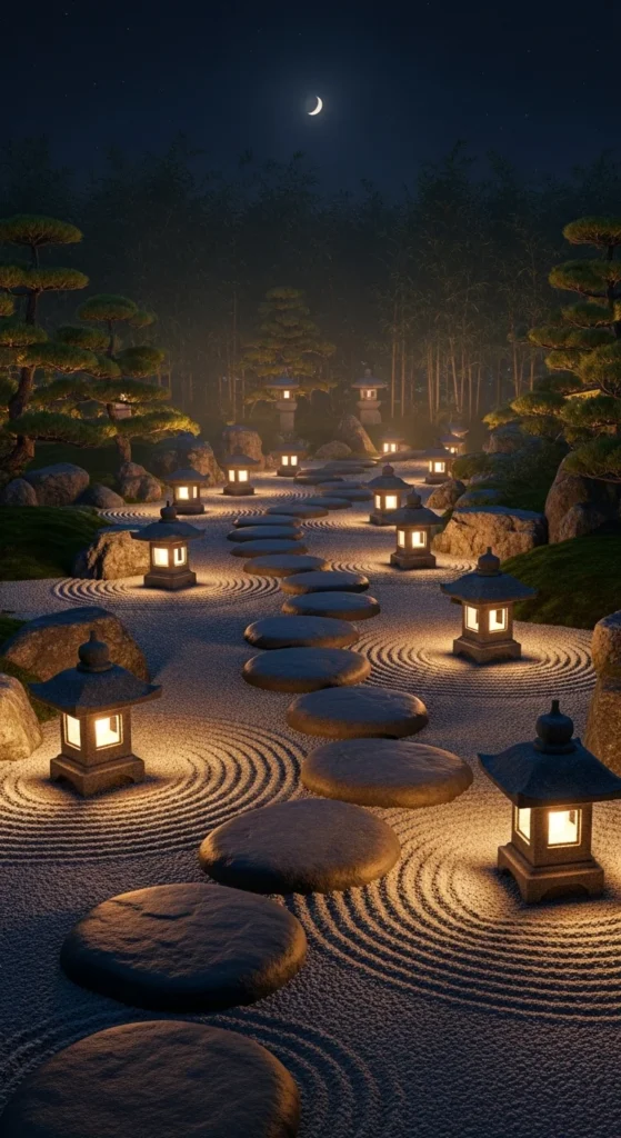 Lighting transforms your garden at dusk. Place Japanese stone lanterns or solar lamps along a path. Their soft glow enhances the sense of stillness and mystery. You can DIY mini lanterns using frosted glass jars and tea lights for an affordable alternative.