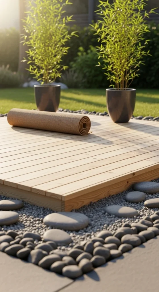 Create a raised wooden platform for meditation or morning tea. Surround it with gravel or sand for contrast. The natural wood texture adds warmth against the cool stones. Keep décor minimal — maybe a single plant or wind chime.